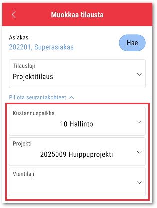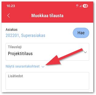 Selainsovelluksessa on mahdollista valita seurantakohde tilauksen otsikkotiedoissa. Nyt tämä mahdollisuus on lisätty myös mobiilisovellukseen.