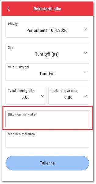 Tuoteuutisissa 3.3.2026 kerroimme mahdollisuudesta asettaa ulkoinen työkuvaus pakolliseksi tallennettassa aikakirjauksia selainsovelluksessa. Nyt asetus koskee myös mobiilisovelluksella tehtäviä aikakirjauksia.