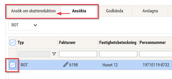 Fakturorna flyttas tillbaka till den första fliken Ansök om skattereduktion