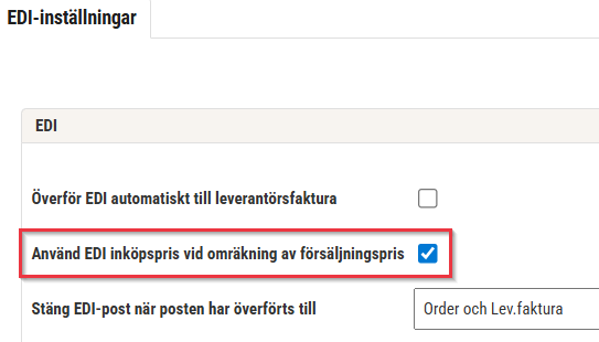 En ny inställning har lagts till: ”Använd EDI-inköpspris för omräkning av försäljningspris”.
