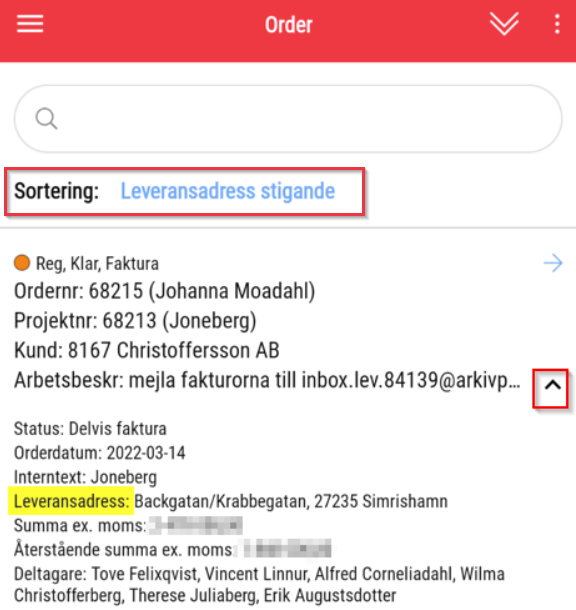 Förutom att du kan sortera på ordernummer, projektnummer, kund och leveransdatum kan du nu även sortera orderlistan på leveransadress i: