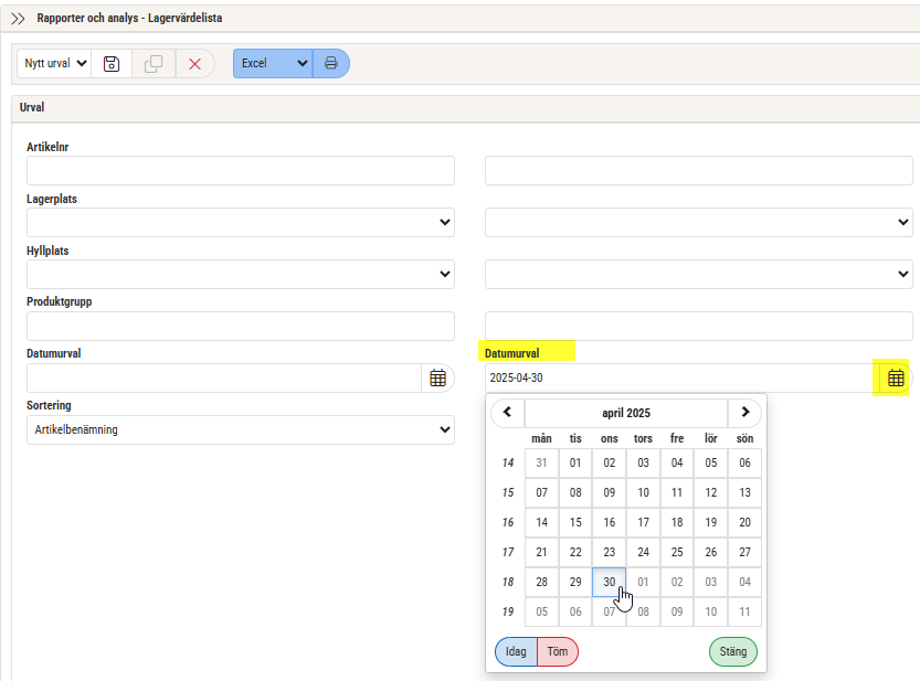 Om du skriver ut lagervärdelistan per 2025-04-30 kommer systemet att använda snittpriset från den inleverans som ligger närmast i tid före eller på detta datum.
